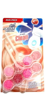 At Home kostka toaletowa w formie zawieszki do WC z formułą 5 x Active. Zawieszka posiada aktywne substancje, dzięki którym przy każdym spłukiwaniu czyści, dezynfekuje i odświeża muszlę toaletową. Zawieszka pozostawia świeży kwiatowy zapach.