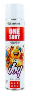 “One Shot” Joy marki Freshtek, to perfumowany odświeżacz powietrza. Określenie “One Shot” oznacza, iż wystarczy jedno przyciśnięcie „spustu”, aby świeży zapach rozszedł się po całym pomieszczeniu. Jest to silnie skoncentrowany aerozol, więc znakomicie nadaje się wszędzie tam, gdzie mamy do czynienia z większą powierzchnią użytkową.