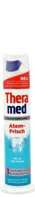 Pasta Theramed Atem-Frische to wysokiej jakości pasta do zębów w bardzo wygodnej stojącej tubie. Pasta dokładnie czyści zęby, a także zapewnia świeży oddech utrzymujący się nawet do 16 godzin. Usuwa przebarwienia i delikatnie wybiela zęby.