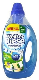 Weisser Riese Universal to żel do prania tkanin kolorowych i białych, zapewniający białym tkaninom śnieżną biel, a kolorowym intensywność koloru. Bardzo skutecznie usuwa trudne plamy i zabrudzenia, a przy tym chroni tkaniny. Sprawia, że prane ubrania są czyste i zachowują długo utrzymujący się świeży zapach. Bez problemu rozpuszcza się w wodzie.